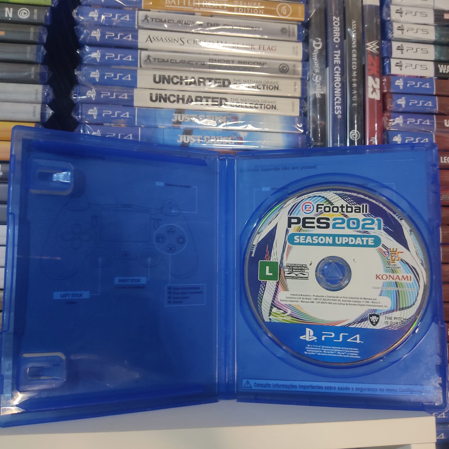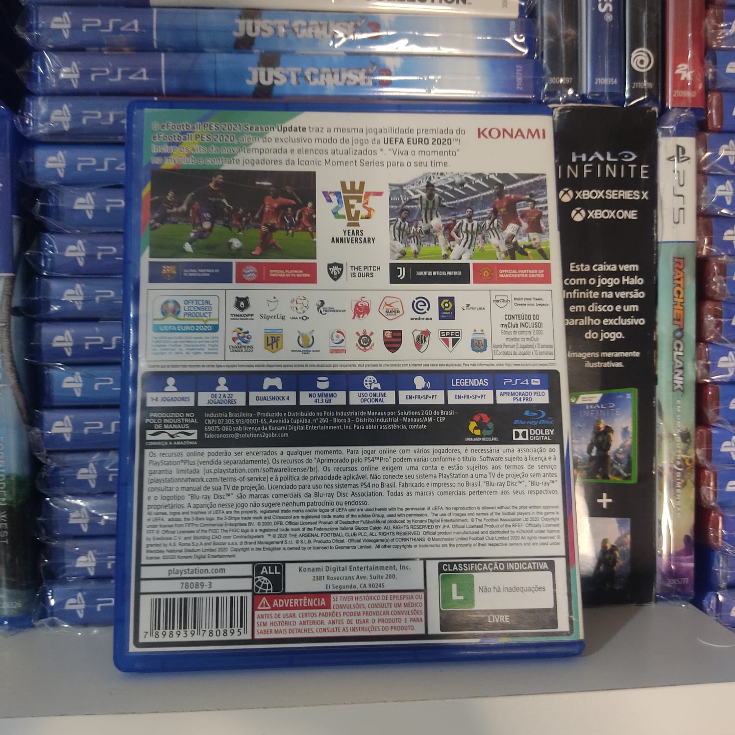 Com o astro Lionel Messi na capa ao lado de outras lendas, este título traz modos clássicos como a Master League, onde você gerencia seu próprio clube, e o MyClub, para montar seu time dos sonhos do zero.